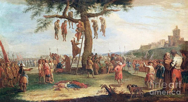 This painting is of military executions. While it is not as bloody as the public executions, it depicts a horrifying, grim procedure in hanging so many, in such an orderly fashion, from one tree.